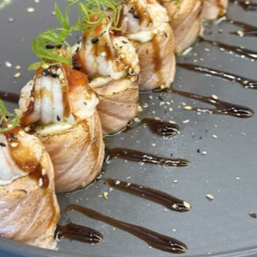 Salmão maçaricado com recheio de camarão empanado com cream cheese e mix de molhos. (8 unidades).