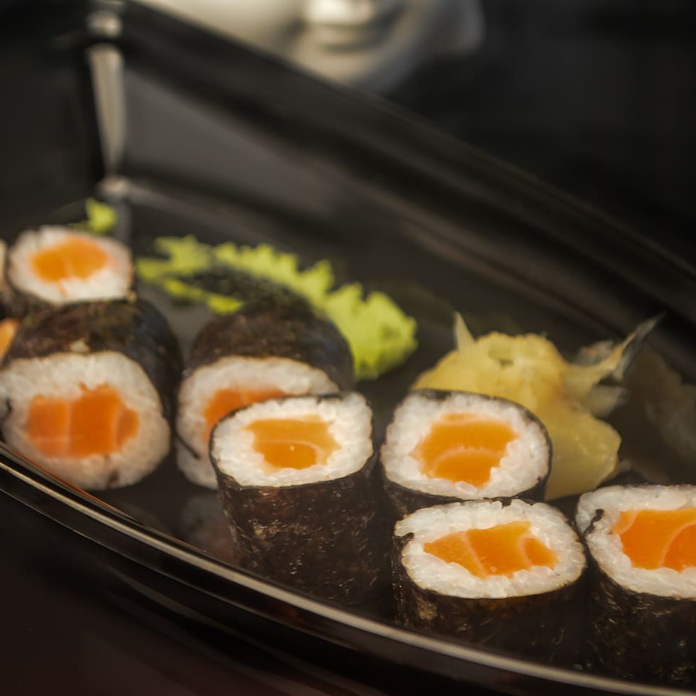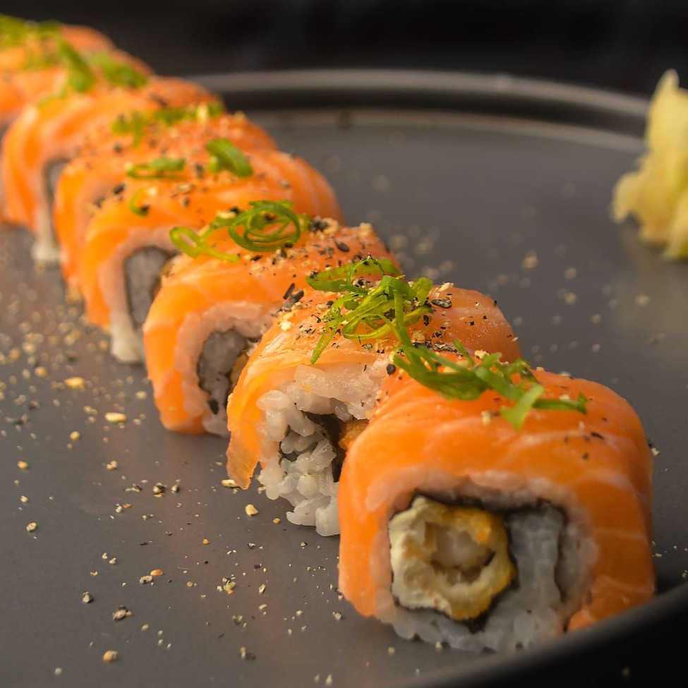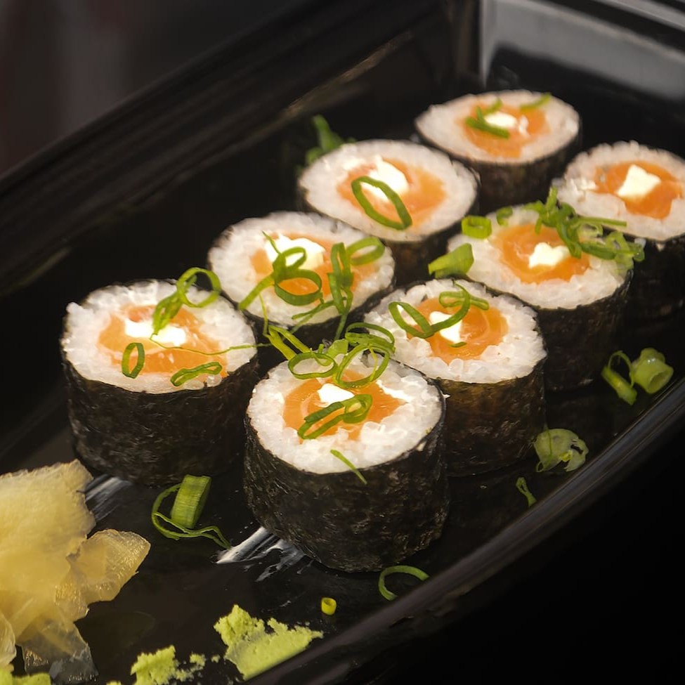 Maki de arroz com cream cheese, recheio de salmão, cebolinha.