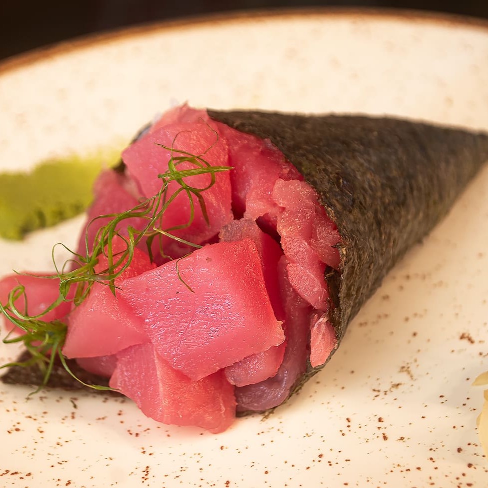 Sem alga! Temaki premium envolto em uma fina lâmina de salmão maçaricado, recheado com salmão fresco, camarão cozido, cream cheese cremoso, arroz e cebolinha. Acompanha molhos da casa.