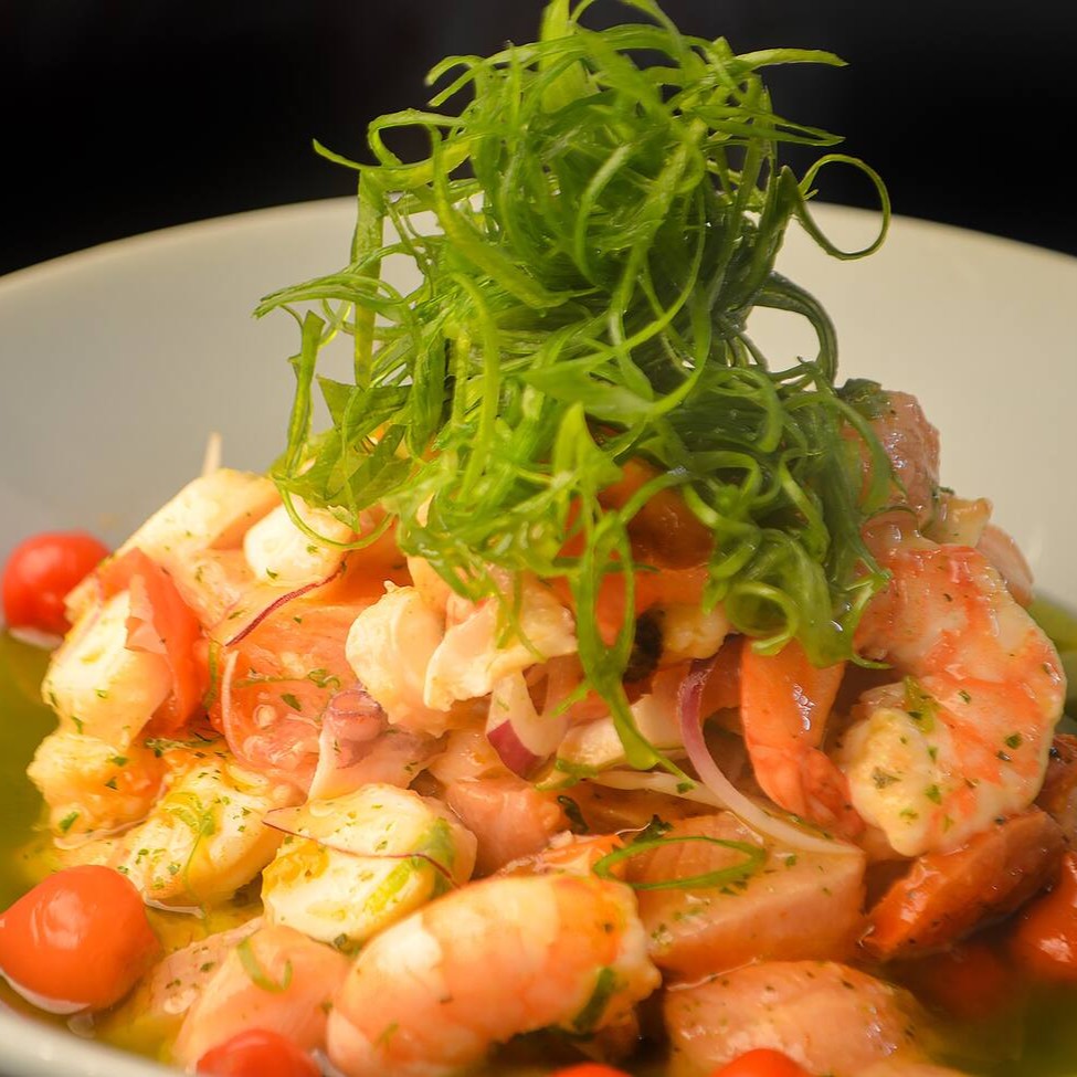 O Ceviche de Frutos do Mar é uma deliciosa explosão de sabores marinhos. Esta especialidade é cuidadosamente preparada com uma seleção premium de salmão, camarão, polvo, kani, peixe shiromy e atum, todos marinados em suco de limão e laranja. Este processo realça a frescura dos ingredientes e lhes confere um toque cítrico irresistível. Os frutos do mar são então realçados com um molho de ervas, que acrescenta uma dimensão adicional de sabor ao prato. Finalmente, a pele crocante do peixe (skin) adiciona uma textura agradável que completa perfeitamente este prato. #salmão #camarão #polvo #kani #peixe #shiromy #atum #skin