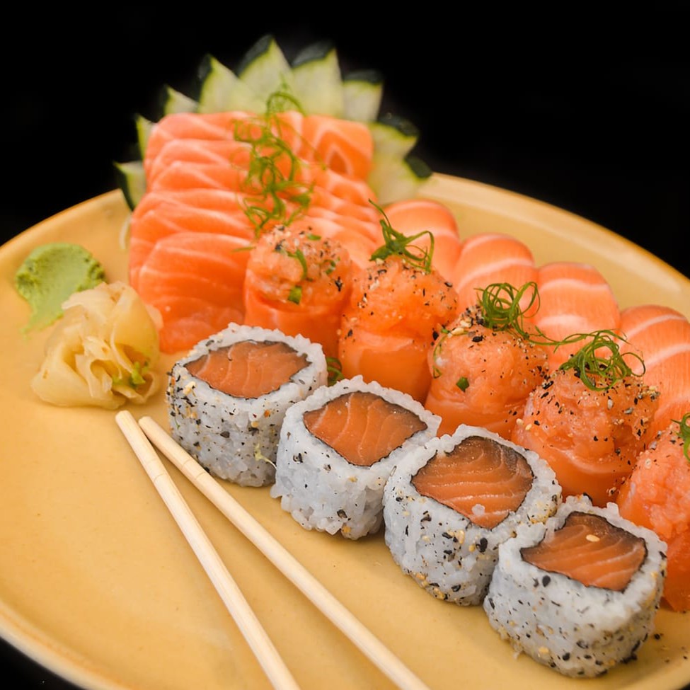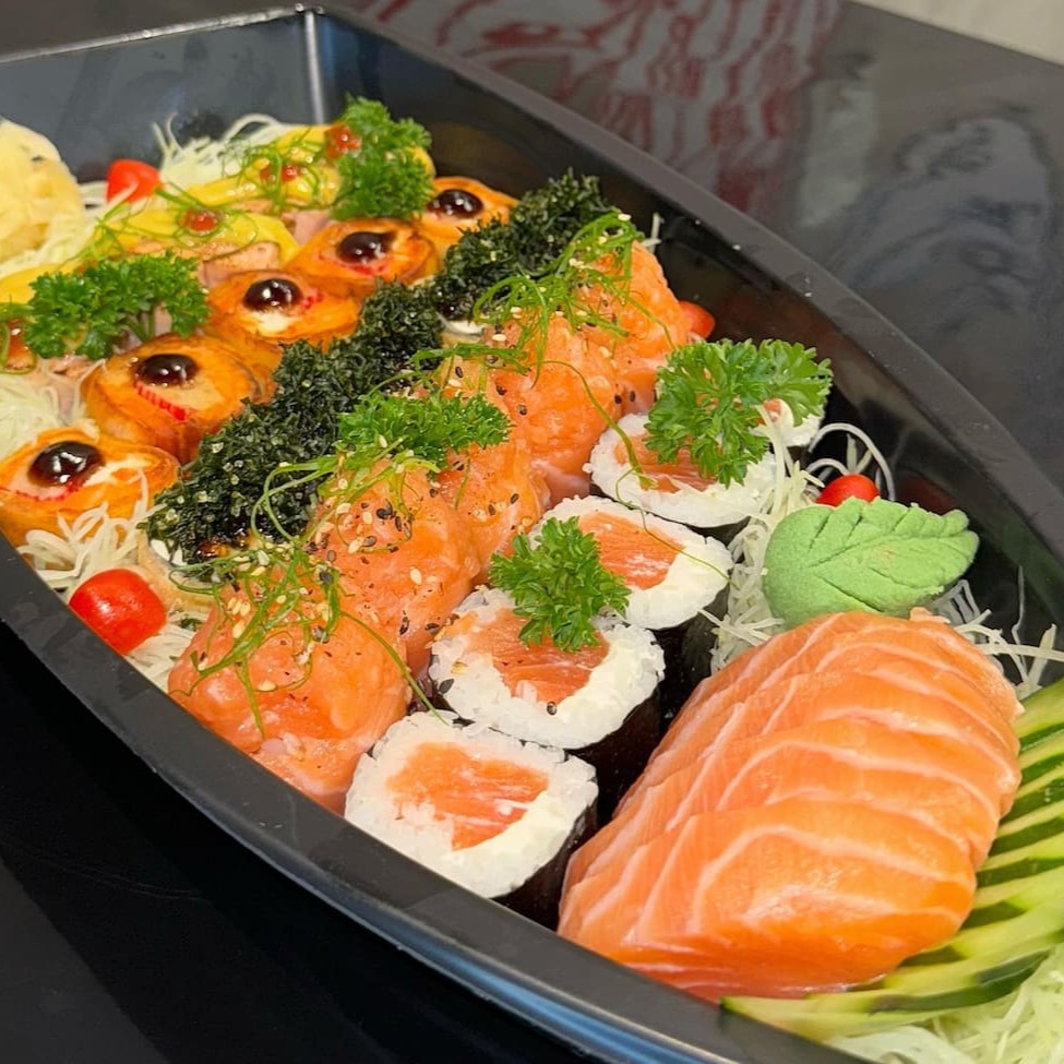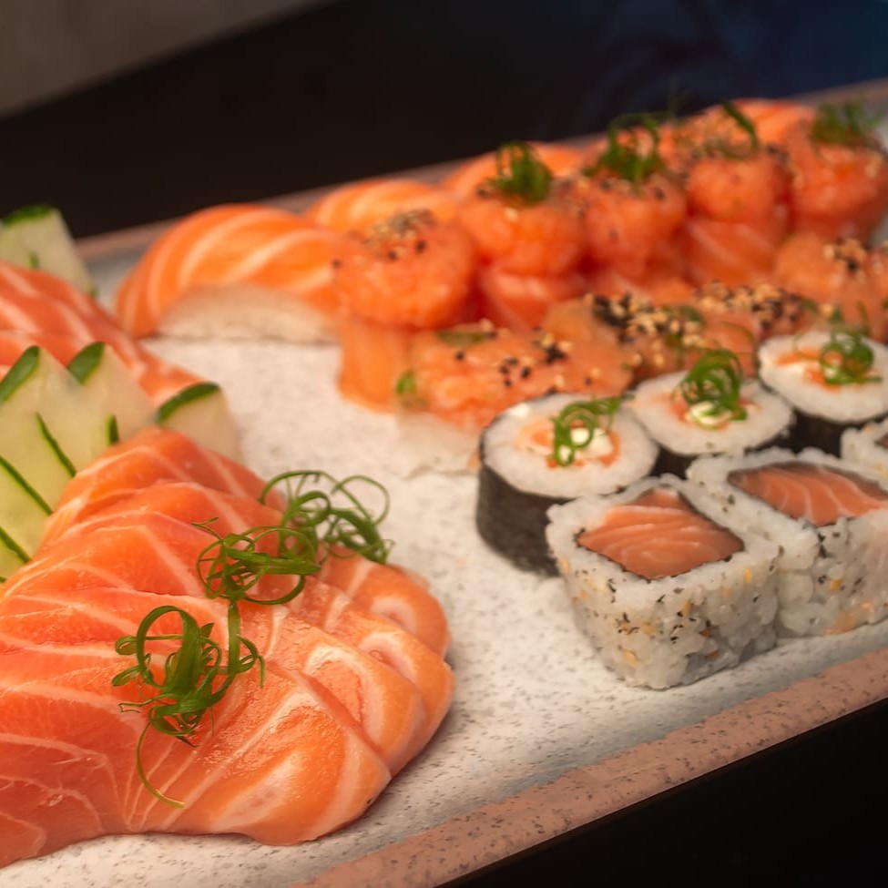 10 Sashimis de salmão, 5 niguiri de salmão, 4 uramaki de salmão, 4 Philadelphia, 5 dyo de salmão e 4 baterá.