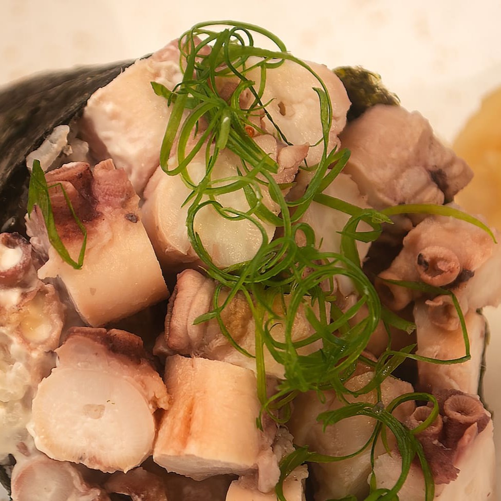 Camarão pré-cozido, polvo pré-cozido, shimeji, cebolinha, gergelim, arroz e nori.
