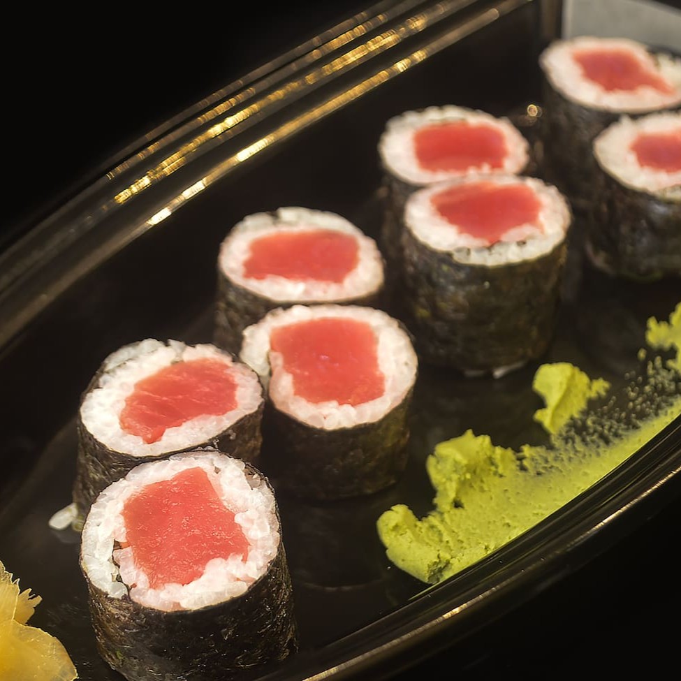 Atum recheado com cream cheese, cebolinha, arroz e nori.