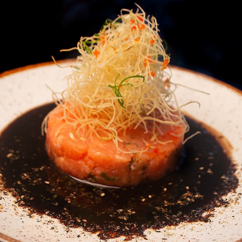 Apresentamos nosso primoroso 'Tartar de Salmão', uma delícia da categoria 'Tartar (300g)'. Este prato é uma harmonia de sabores, trazendo tenros pedaços de salmão, cuidadosamente temperados com um sofisticado molho de ervas. A adição de flor de sal ressalta a essência do mar, enquanto as cebolinhas trazem um toque suave e aromático. O molho ponzu, com seu caráter cítrico, equilibra perfeitamente a riqueza do salmão. Para finalizar, o crispy de batata doce acrescenta uma textura crocante, que contrasta maravilhosamente com a suavidade do peixe. #salmão #ponzu #flordesal #batatadoce