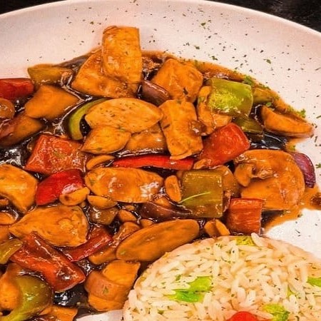 Frango Xadrez, Arroz branco com brócolis e amendoim torrado.