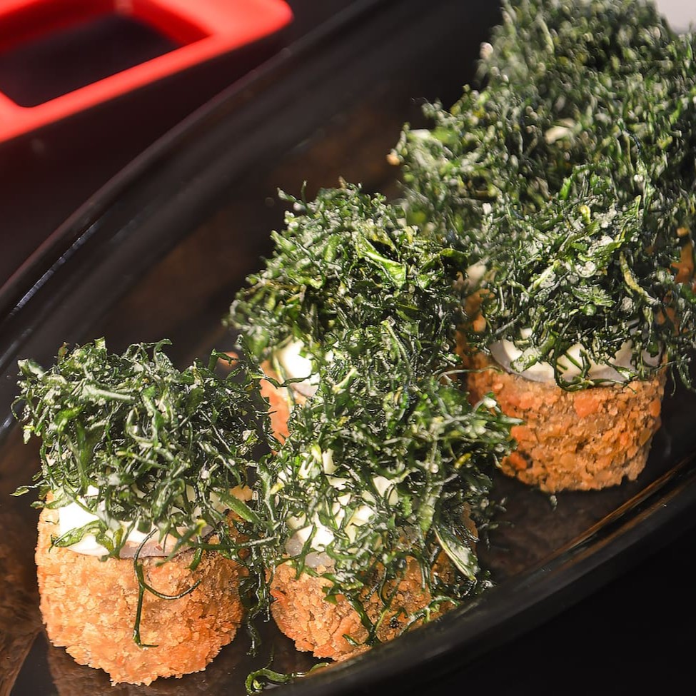 Camarão empanado, shimeji, cebolinha, cream cheese, arroz e nori.