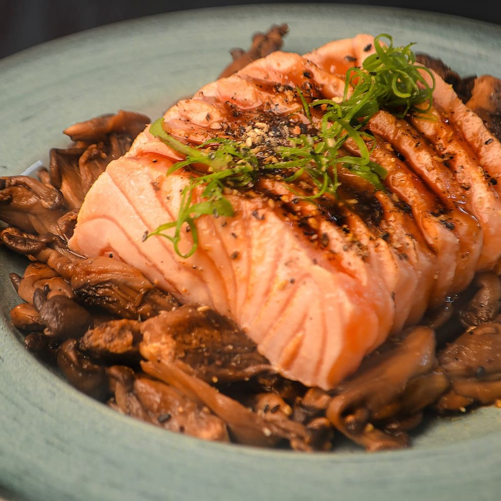 Sashimi De Salmão Maçaricado Com Shimeji (6 Peças).
