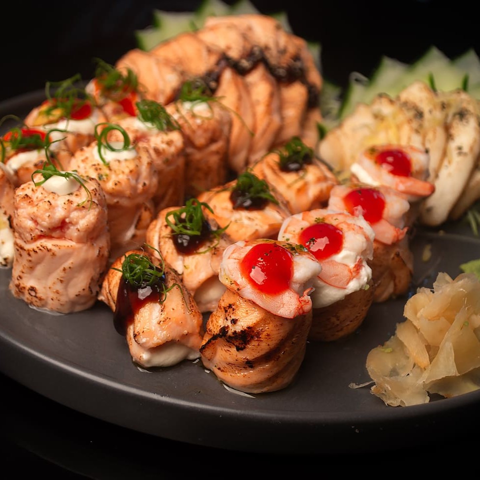 Temakis Maçaricados de Salmão, Camarão, Frutos do Mar, Salmão grelhado e Salmão Fresco e Camarão.