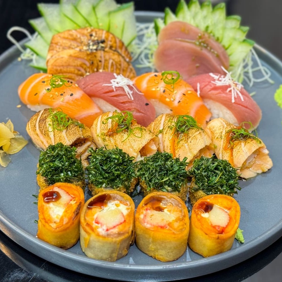 Para quem quer provar de tudo! Uma seleção premium de 40 peças: 5 Sashimis Maçaricados, 5 Hossomakis de Salmão, 5 Dyos de Shimeji, 5 Ebitems crocantes, 5 Hot Rolls, 5 Mirukas, 5 Gel Makis e 5 Niguiris de Salmão.