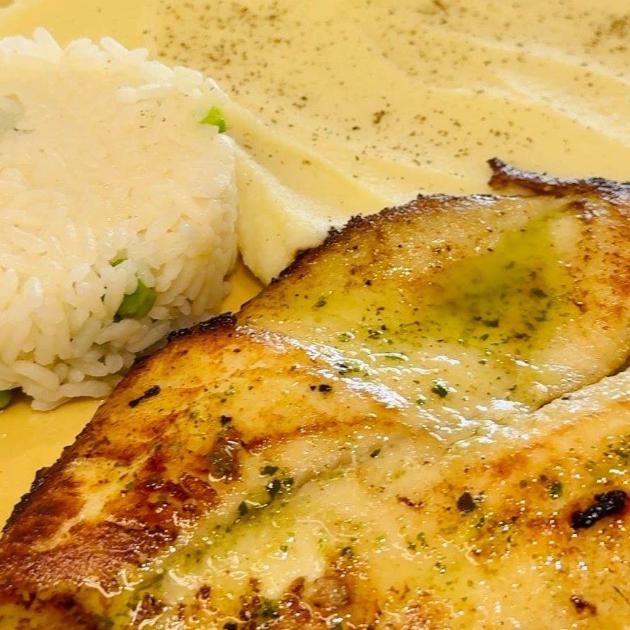 Tilápia grelhada ao molho de ervas, arroz branco com ervilhas e purê de batata.