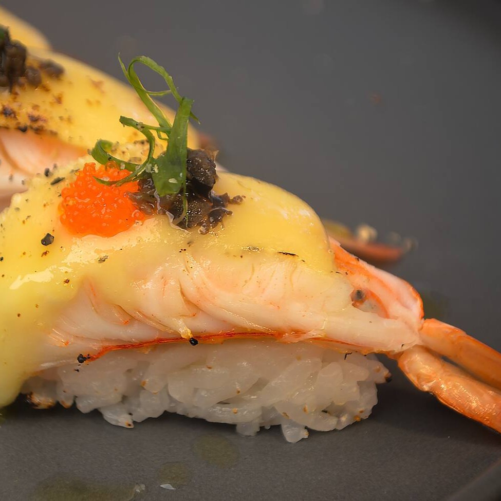 Niguiri de camarão com queijo Brie maçaricado, salsa trufada com mel, cebolinha e ovas de massagó.
