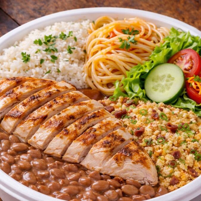 Marmita completa de Frango Grelhado, arroz, feijão de caldo, macarrão temperado, farofa crocante e salada do Dia, selecione as opções !
