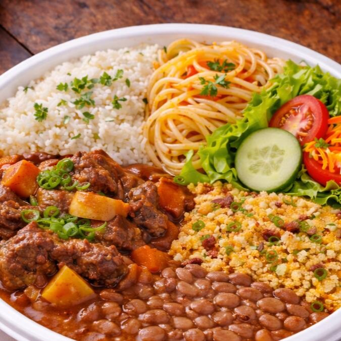 Marmita completa de Carne de Panela, arroz, feijão de caldo, macarrão temperado, farofa crocante e salada do Dia, selecione as opções !