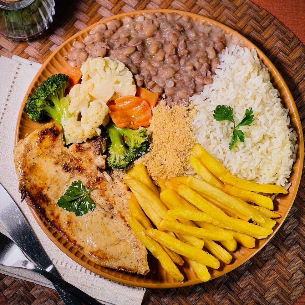 Filé de frango grelhado. Acompanha legumes, arroz, feijão, batata frita e farofa. Serve 1 pessoa.