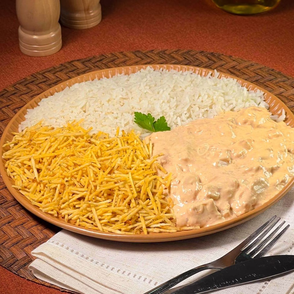Acompanha arroz branco e batata palha. Aproximadamente 450g. Serve 1 pessoa.