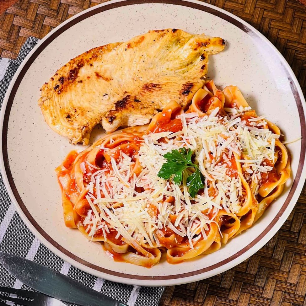 Filé de frango grelhado. Acompanha macarrão ao molho sugo. Serve 1 pessoa.