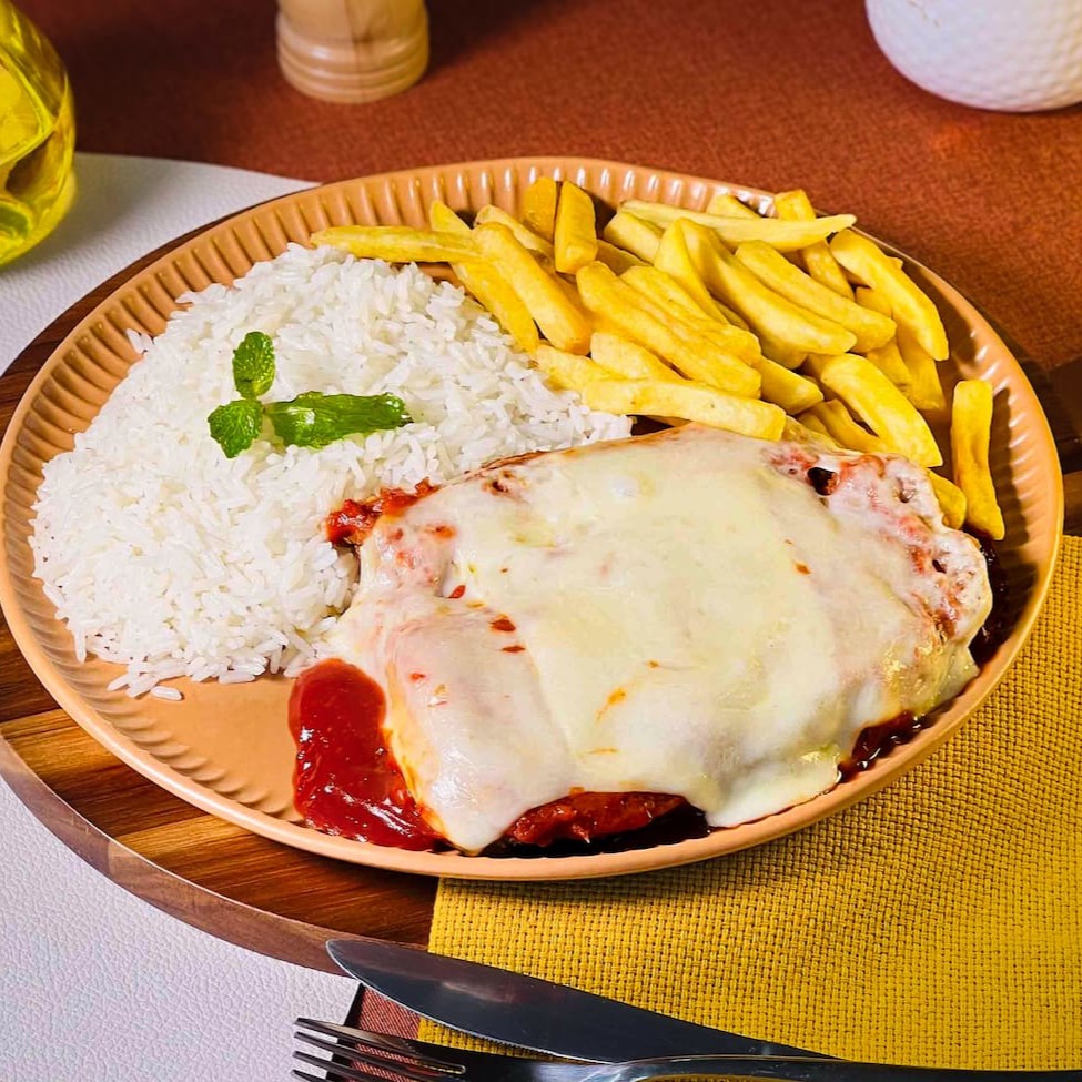 Acompanha arroz branco e batata frita. Serve 1 pessoa.