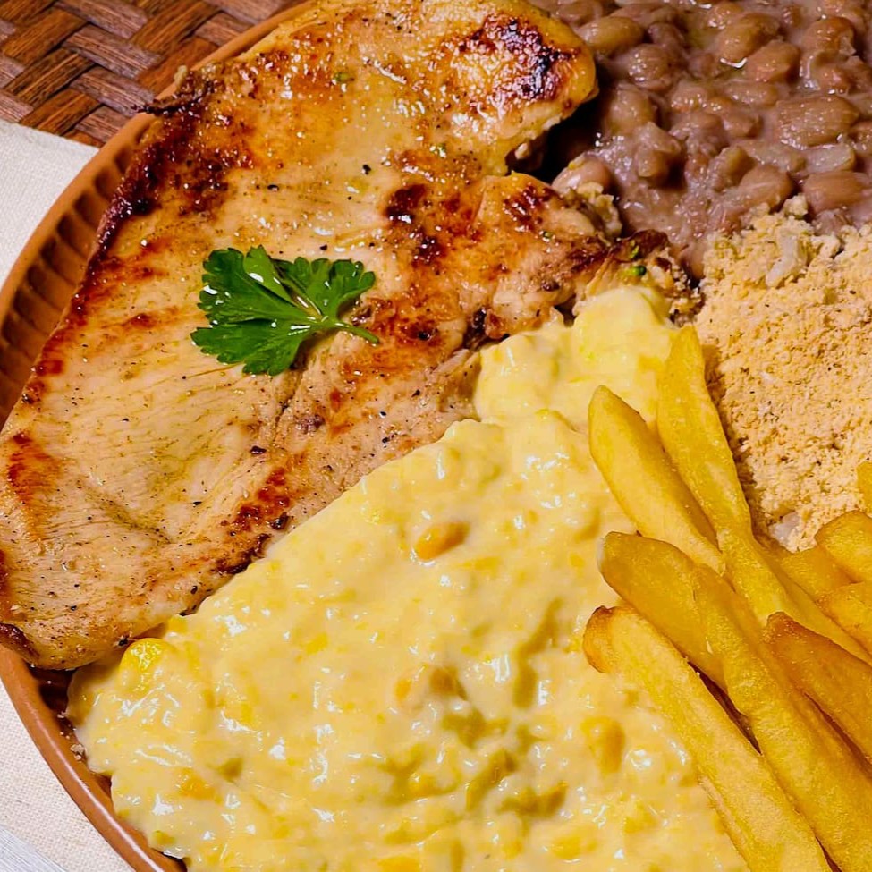 Filé de frango grelhado. Acompanha creme de milho, arroz, feijão, batata frita e farofa. Serve 1 pessoa.