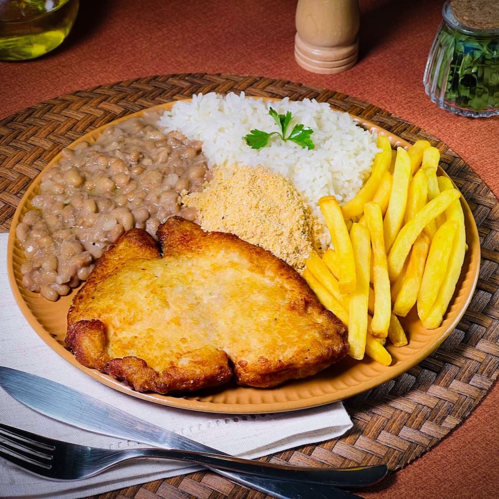 Filé de frango milanesa. Acompanha arroz, feijão, batata frita e farofa. Serve 1 pessoa.