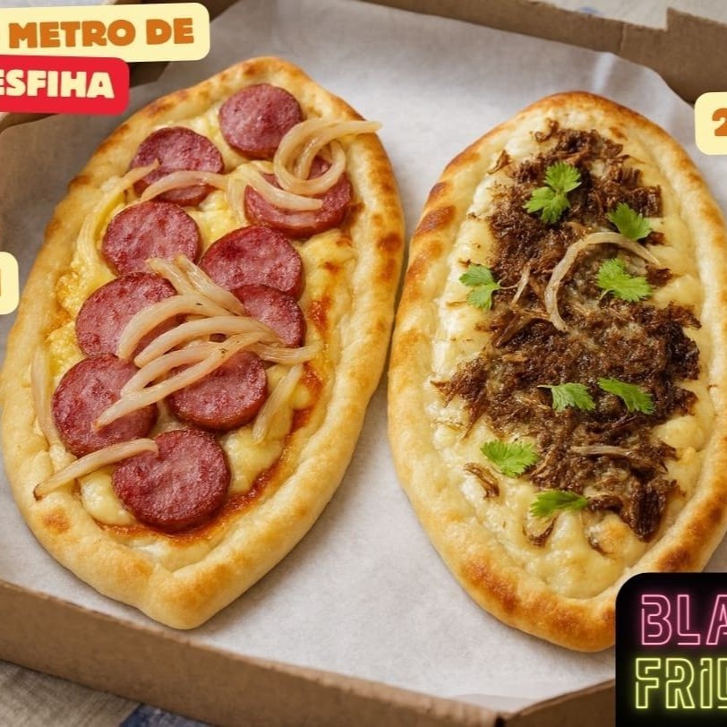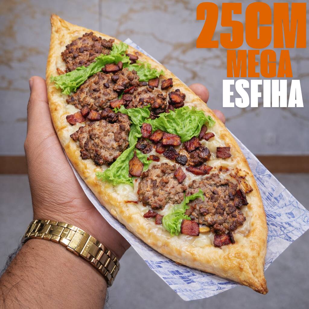 Escolha seu Pais/Estado Meio Metro, 50cm de Esfiha, cada Mega Esfiha tem 25cm de comprimento, para você encher a barriga com apenas uma! Esfihas turcas abertas, sabores conforme pais ou estado super recheadas e deliciosas.