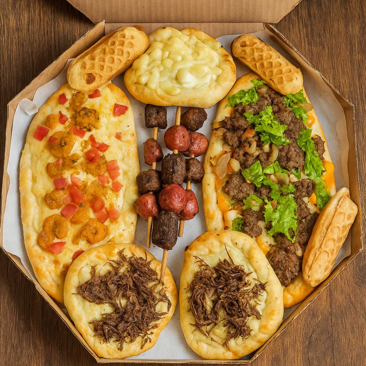 2 Mega, 3 Mini, 3 Espetinhos, 3 Crepes - Escolha seu País ou Estado. Super Box para comer a vontade e se deliciar com cada sabor.