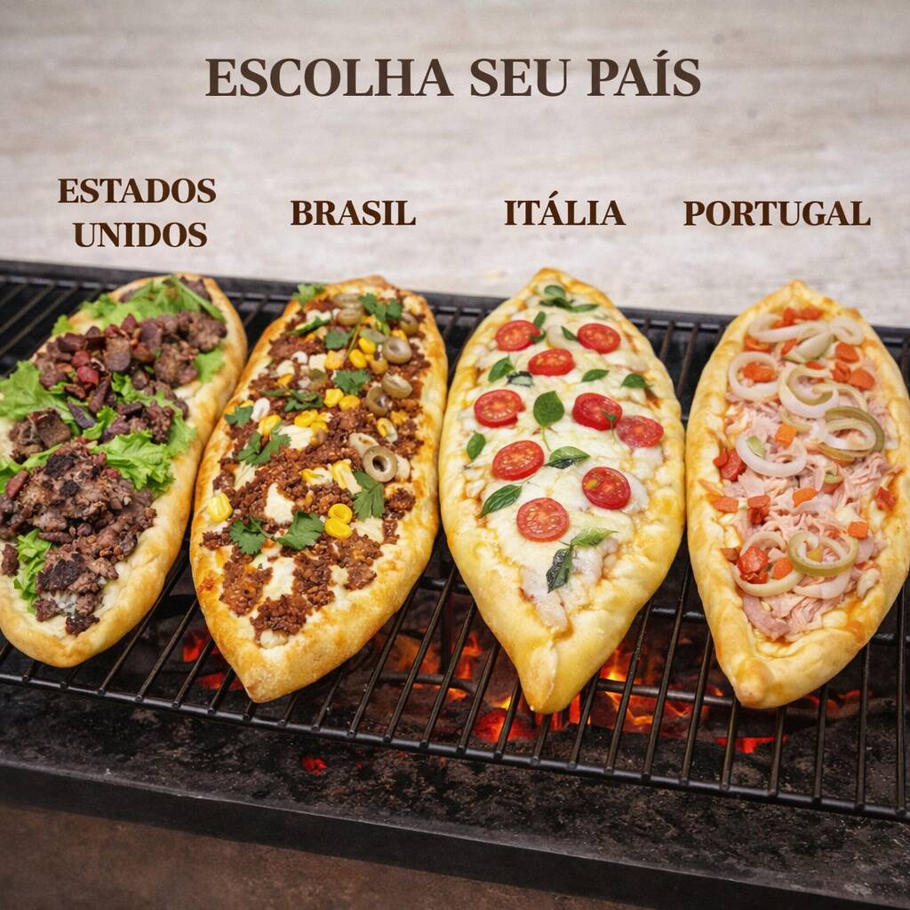 Cada Esfiha tem 25cm de comprimento, para encher a barriga! Base das esfihas com Cream Cheese ou Catupiry Brasil: (Molho de tomate, Carne Moída temperada ao alho e cebola, milho e azeitonas.) Portugal: (Molho de tomate, presunto, pimentão vermelho picado e azeitonas, com cebola) Eua: (Chedar e Barbecue, Blend de Hamburguer artesanal, e alface) Itália: (Molho de tomate, tomate cereja, manjericão)