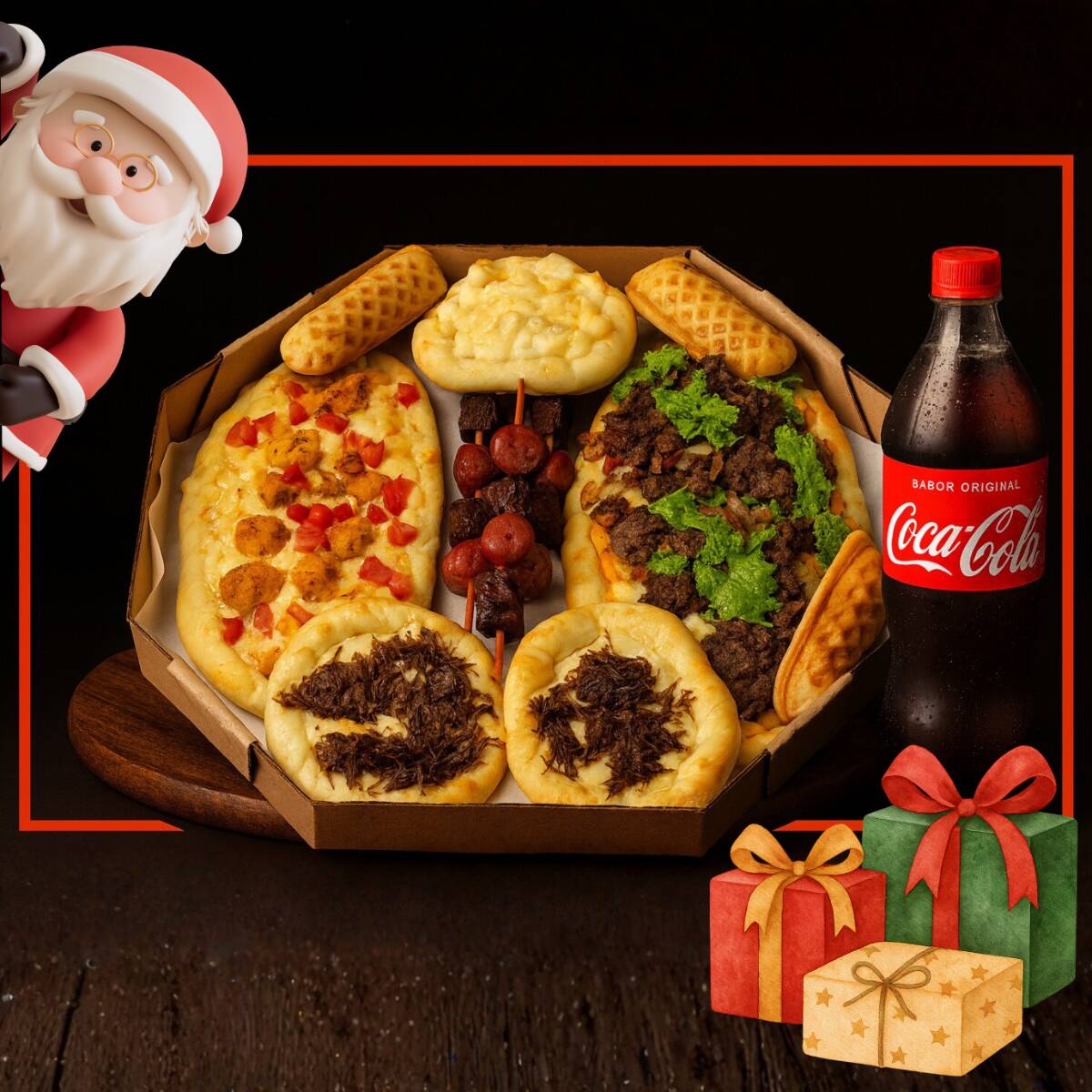 2 Mega, 3 Mini, 3 Espetinhos, 3 Crepes + 1 Refri de 1l (Coca ou Antartica) Escolha seu País ou Estado. Super Box para comer a vontade e se deliciar com cada sabor.