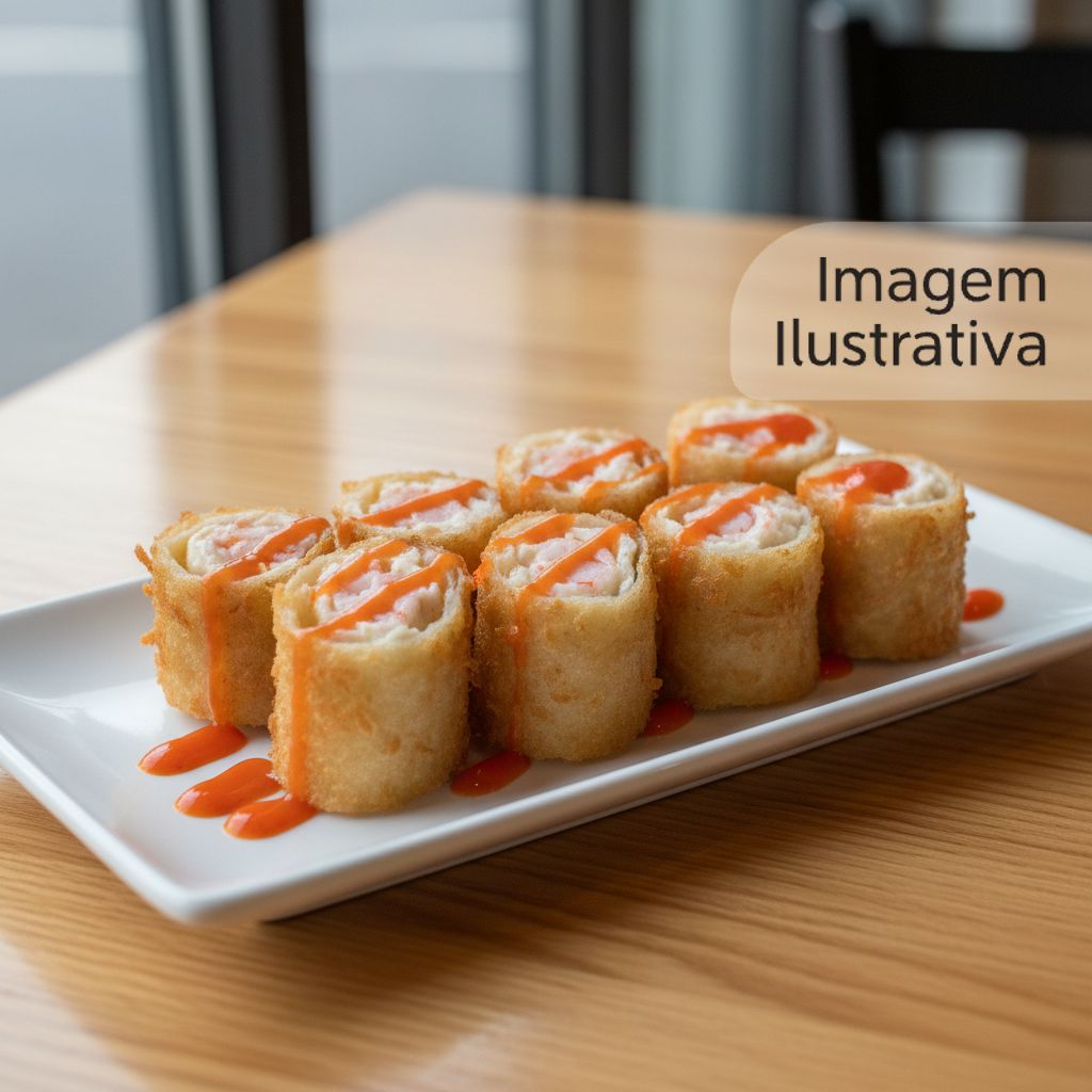 Delicioso rolinho de sushi empanado com recheio de salmao e cream cheese, finalizado com molho teriaky