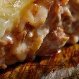 É feito de molho de tomate, mussarela gratinada com queijo parmesão.