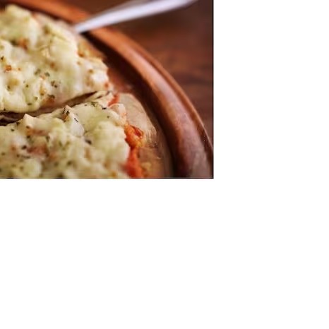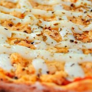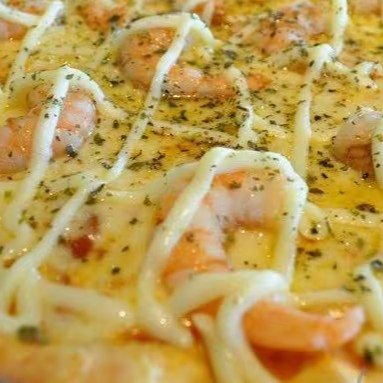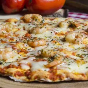 Massa, molho de tomate, camarão, Catupiry, alho frito e orégano.