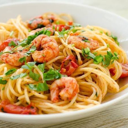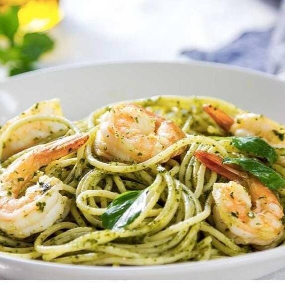Legumes, macarrão, carne, frango e camarão.