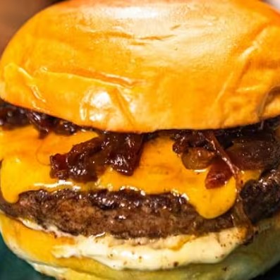 Pão brioche, 2 blends de 150g, bacon, queijo cheddar, cebola caramelizada e maionese.