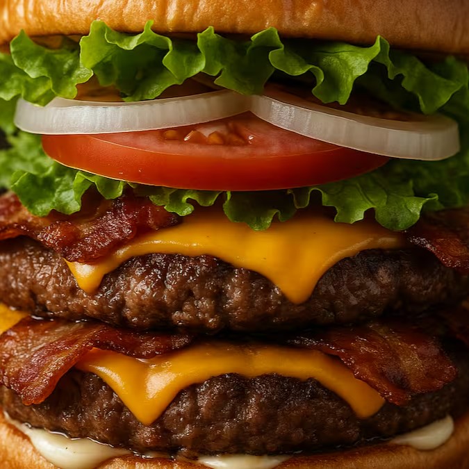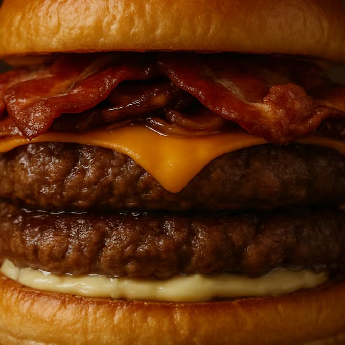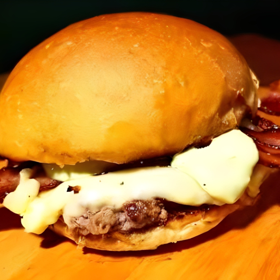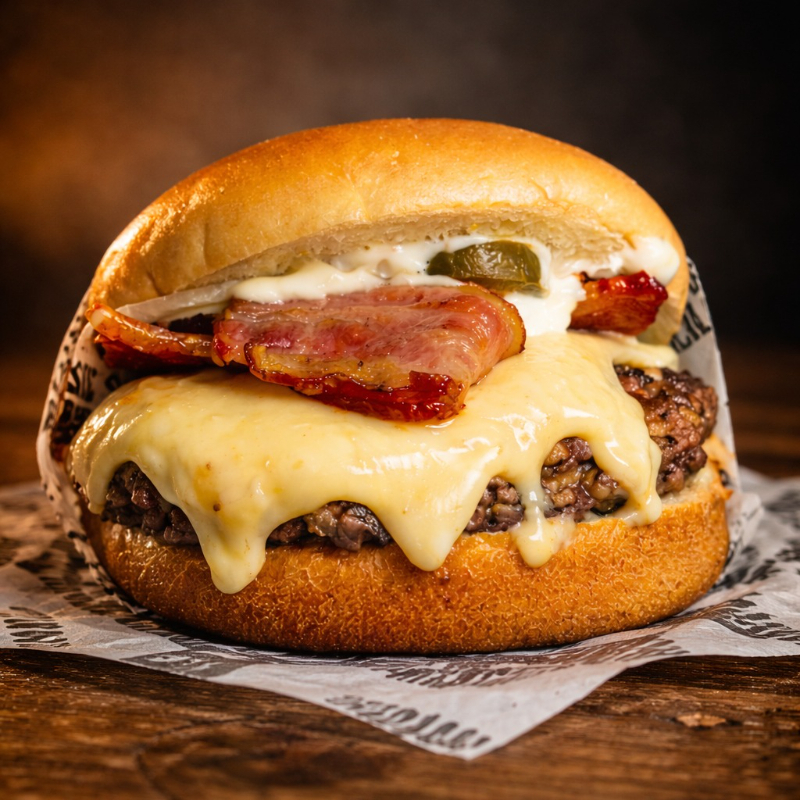 Um pão brioche chapeado, douradinho e macio, abraça um smash duplo suculento que entrega sabor intenso a cada mordida. Por cima, o queijo prato derretido traz cremosidade e equilíbrio, enquanto o bacon crocante adiciona aquele toque irresistível de textura e sabor defumado. Tudo finalizado com a nossa maionese especial, que potencializa cada ingrediente, transformando esse hambúrguer em uma experiência gastronômica completa e inesquecível.