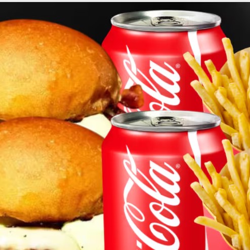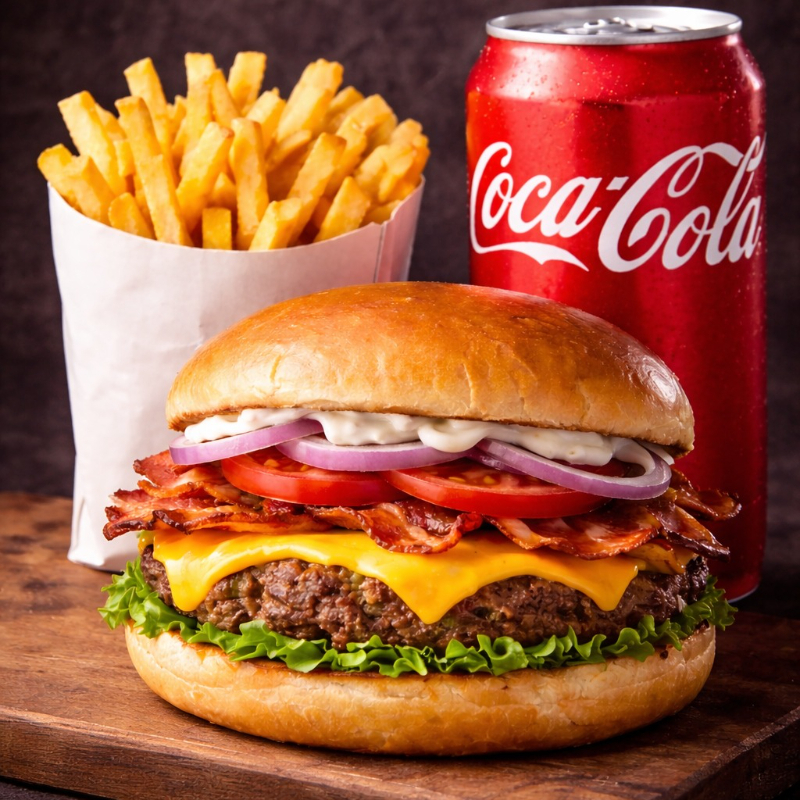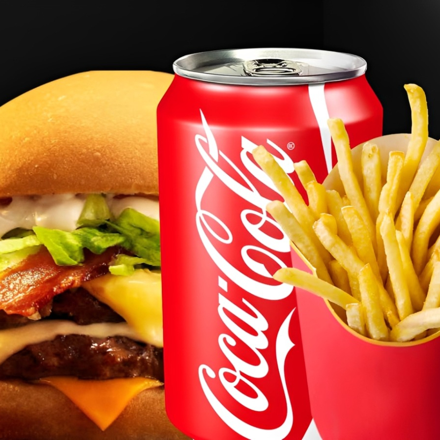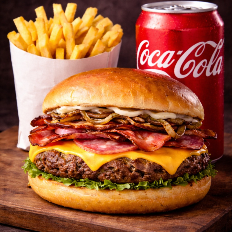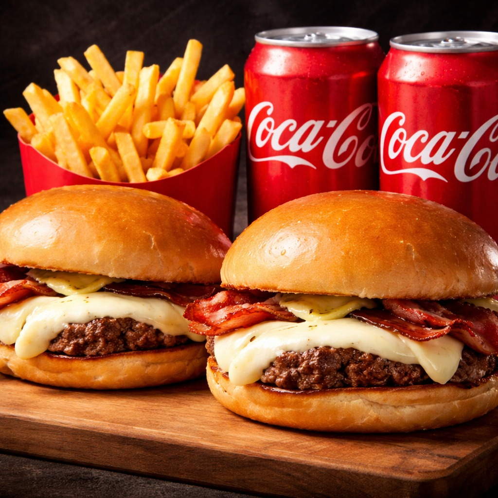 Dois hambúrgueres suculentos com pão brioche, blend artesanal de 150g, queijo mussarela derretido, bacon crocante, cebola fresca e nossa maionese especial da casa. Acompanha duas porções generosas de batata frita dourada e crocante e duas latas bem geladas de Coca-Cola.