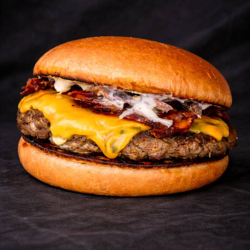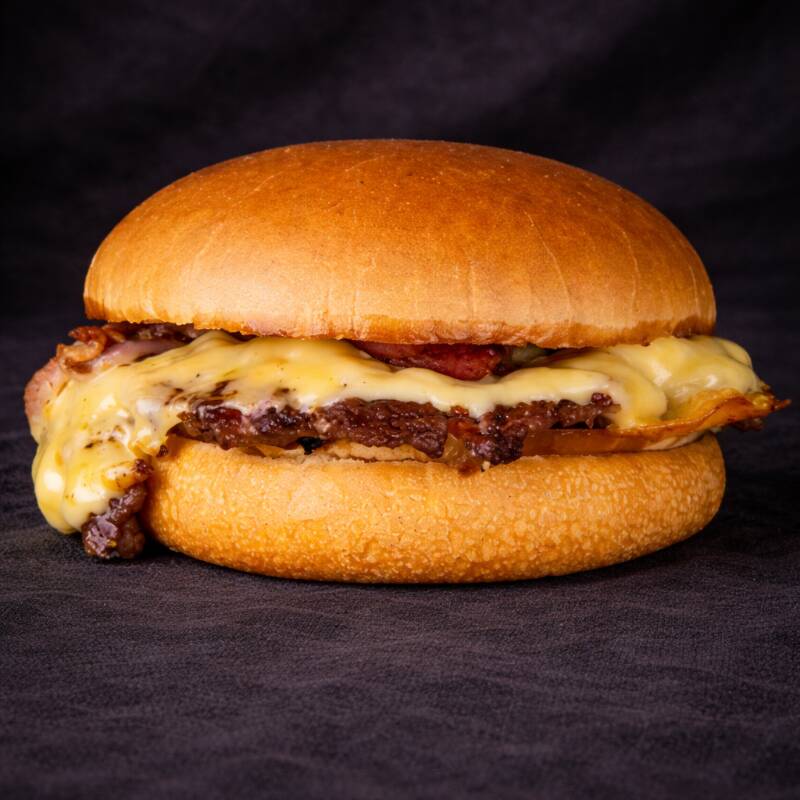 Preparado com nosso blend artesanal de 150g, grelhado na perfeição para garantir suculência e sabor intensos a cada mordida. Coberto por queijo cheddar derretido que derrete na boca, acompanhado de fatias crocantes de bacon que adicionam textura e um sabor defumado irresistível. Tudo isso servido no clássico pão brioche levemente tostado, que oferece maciez e uma crocância delicada na medida certa.