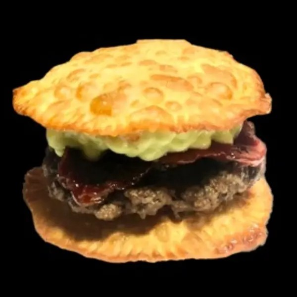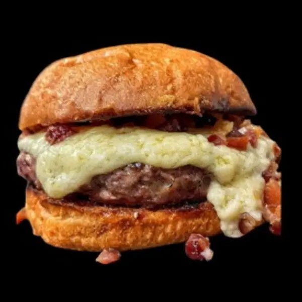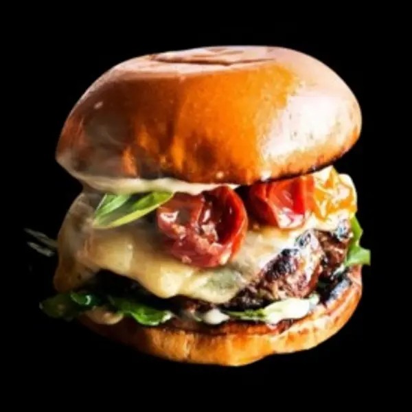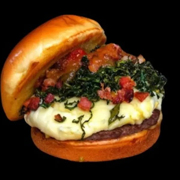 Pão brioche, 160g de carne, bacon em fatias maionese verde da casa, folhas de manjericão, queijo mussarela, tomate seco e alface americano.