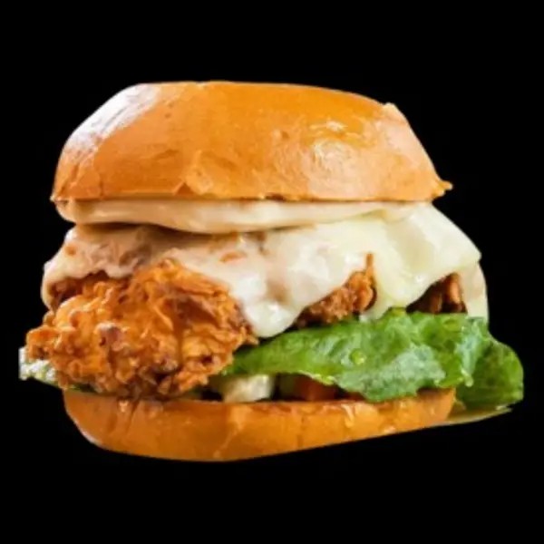 Pão batata, 160g de frango empanado,queijo mussarela, picles, alface, tomate fresco e manjericão maionese verde da casa.
