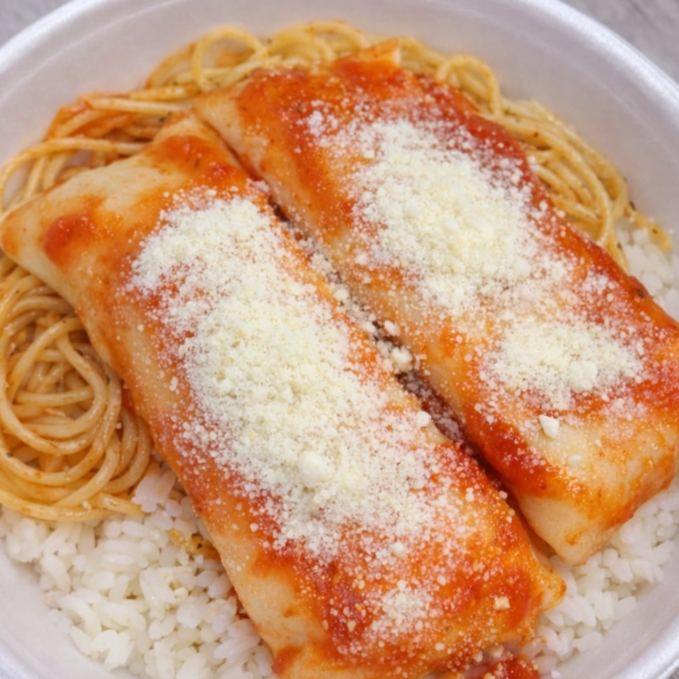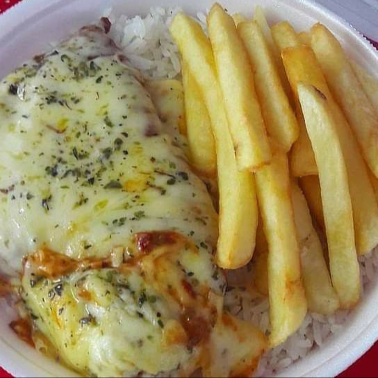 Parmegiana de carne acompanhado com arroz branco e batata frita