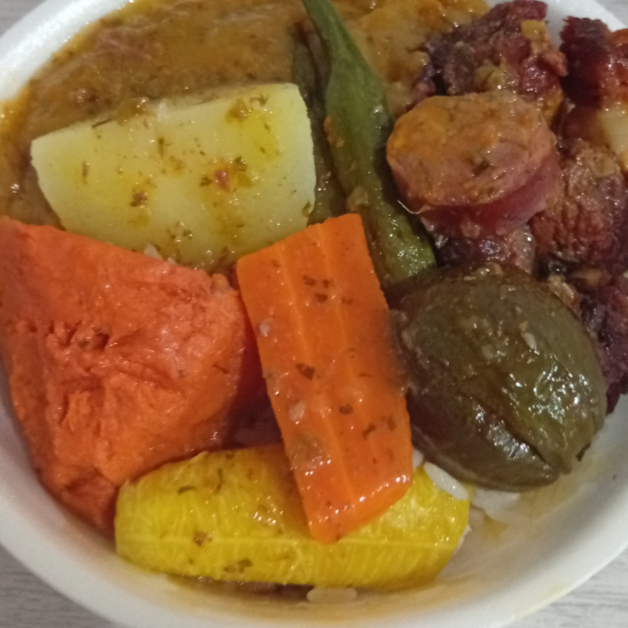 (750gramas)Carne cozida com pirão feito com o caldo da carne ,abóbora ,banana da terra, quiabo, batatinha...