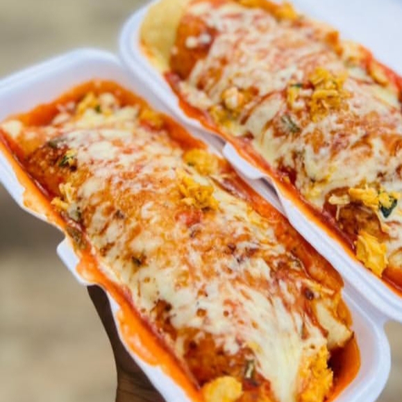 Panqueca de 20 cm recheada com frango cremoso,bacon,molho branco ou molho de tomate finalizada com queijo mussarela.