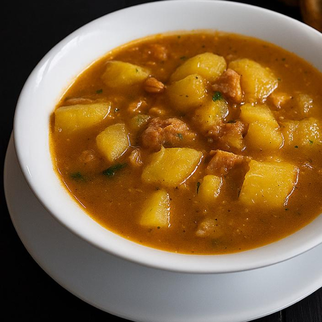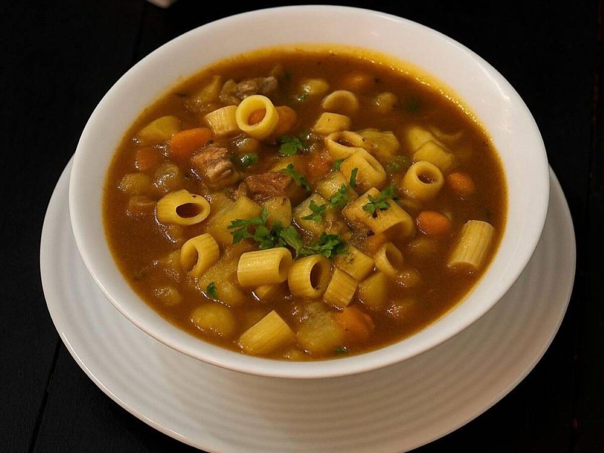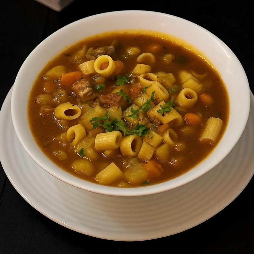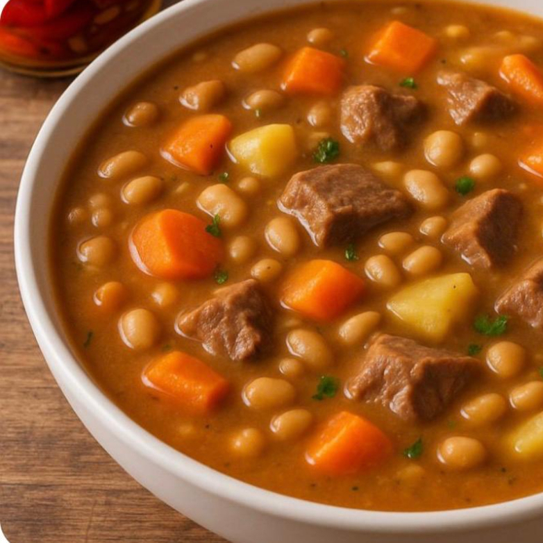 Deliciosa sopa de legumes com pedaços de carne bem molinha e suculenta.
