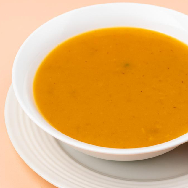 Sopa de legumes batida, com frango desfiado. Esta sopa não contém macarrão.