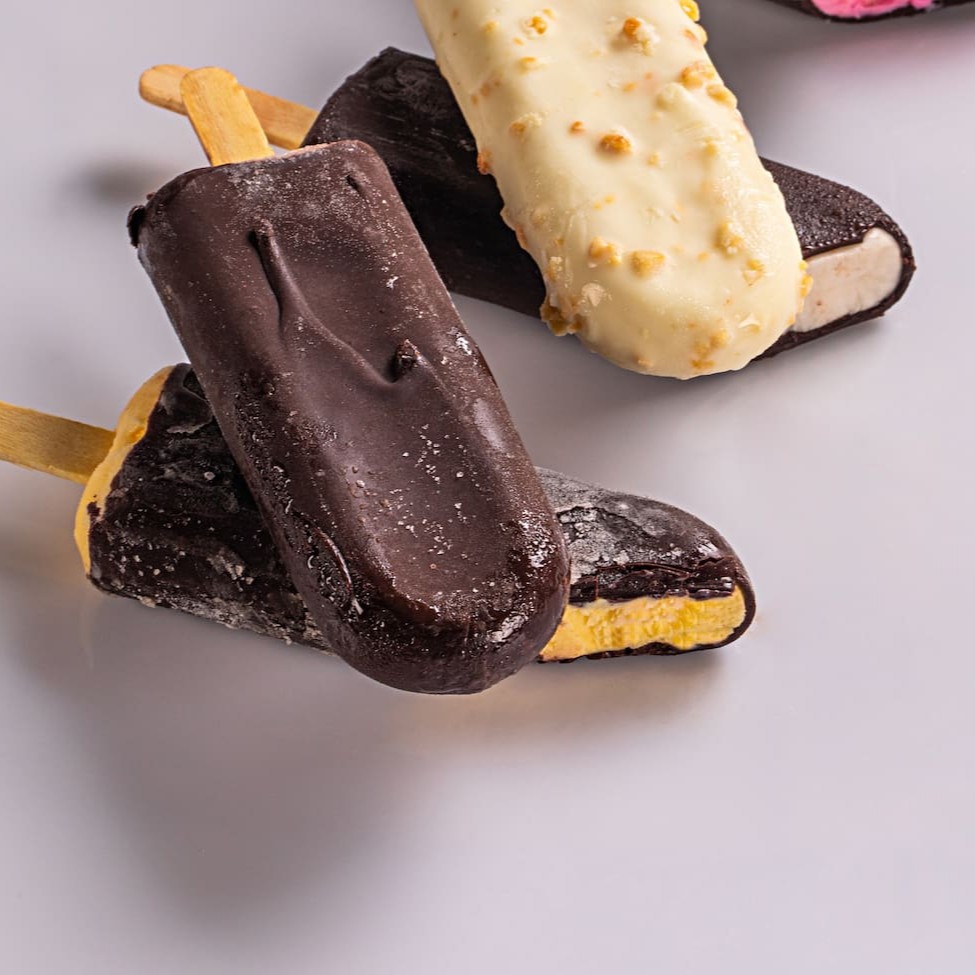 Delicioso picolé de coco com deliciosa casquinha de chocolate meio amargo