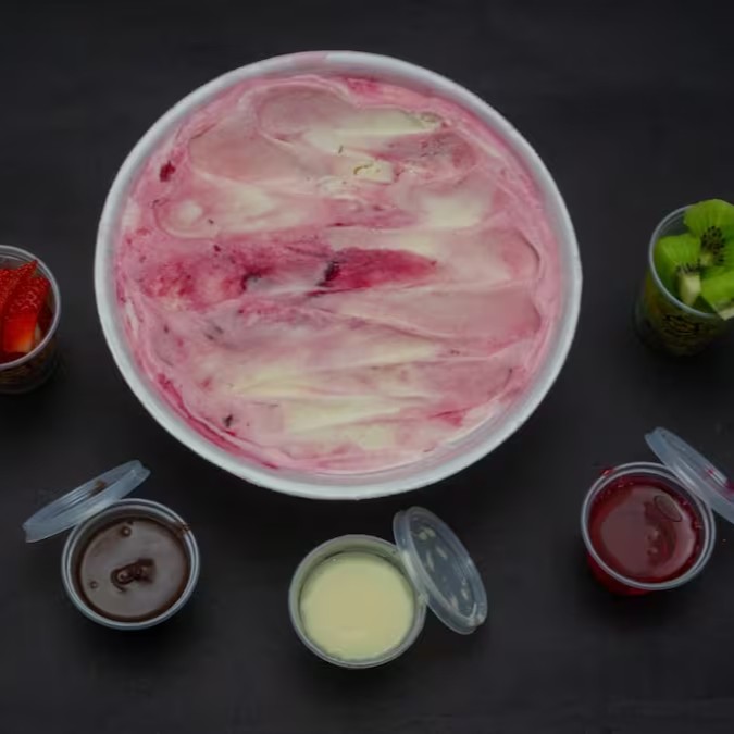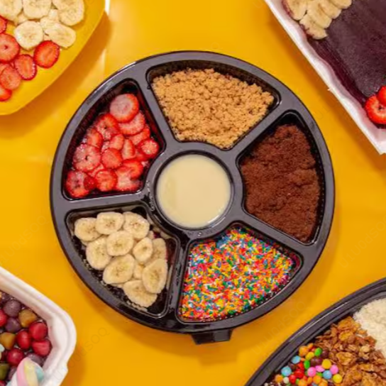 Creme em camadas +04 acompanhamentos gratuitos. Os 04 Acompanhamentos gratuitos irão dentro do copo, entre as camadas de creme.