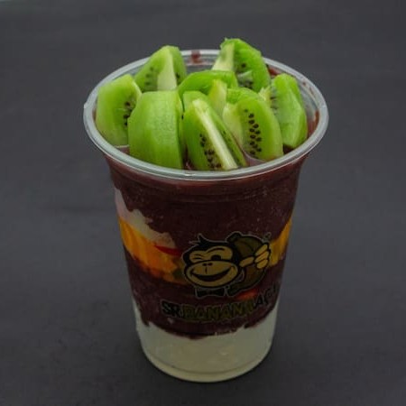 Açaí em camadas +03 acompanhamentos gratuitos. Os 03 Acompanhamentos gratuitos irão dentro do copo, entre as camadas de açaí.os.