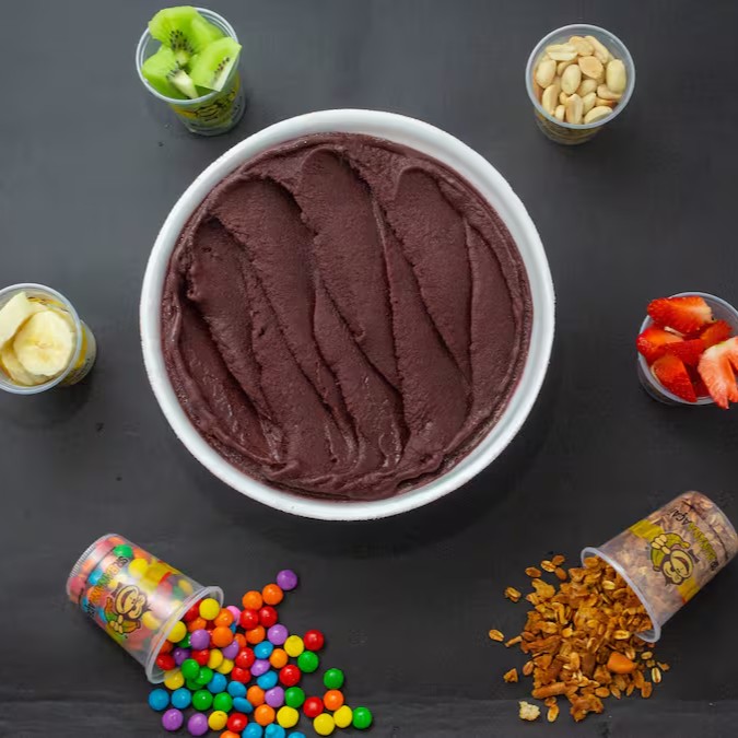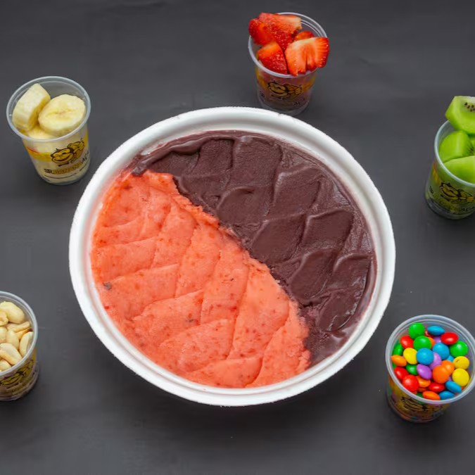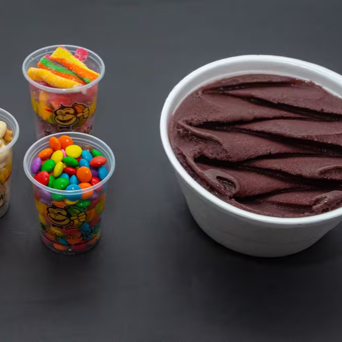 Açaí em camadas +04 acompanhamentos gratuitos. Os 04 Acompanhamentos gratuitos irão dentro do copo, entre as camadas de açaí.