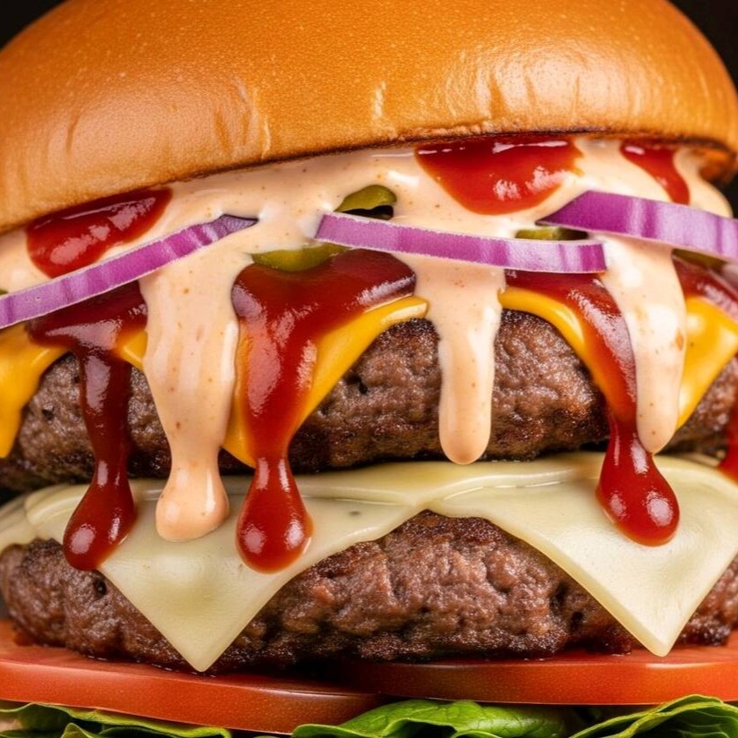 Hambúrguer, queijo derretido e molhos