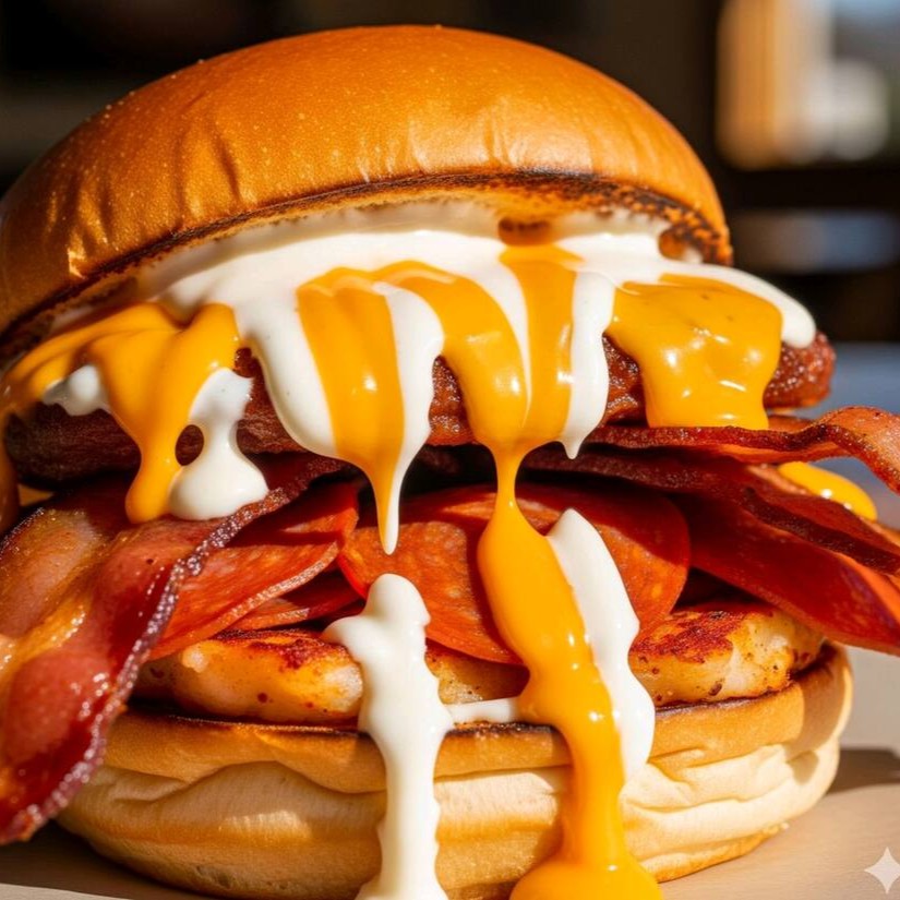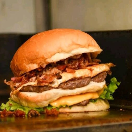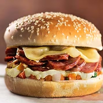 Hambúrguer, queijo, calabresa, bacon, ovo, cheddar cremoso e cream chesse
