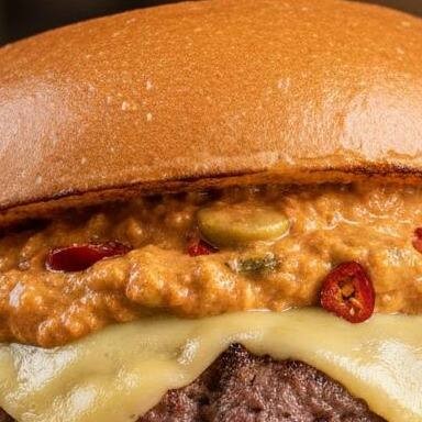 Carne de hamburguer, pimenta calabresa, queijo, molho cheddar, creme de pimenta feito com azeitonas