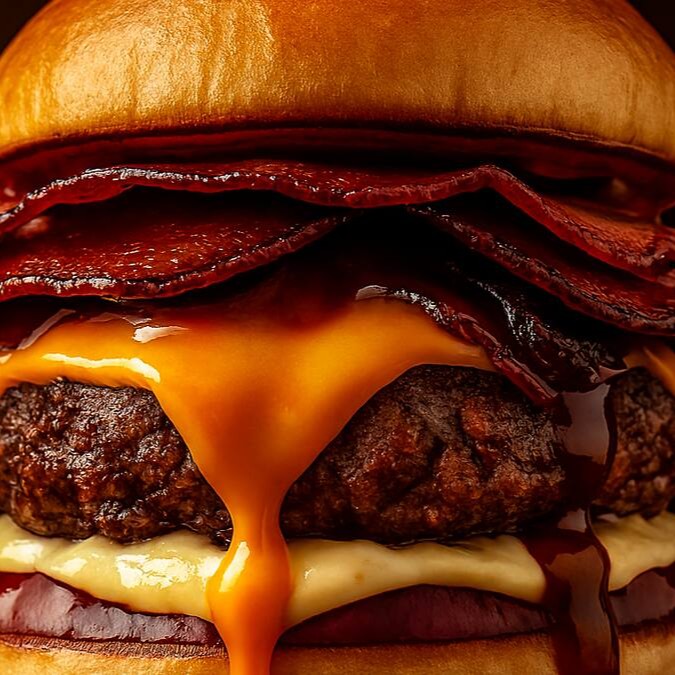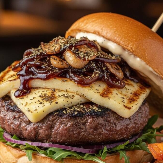 Carne Artesanal De Patinho, Queijo, Bacon, Barbecue, E Cebola Caramelizada